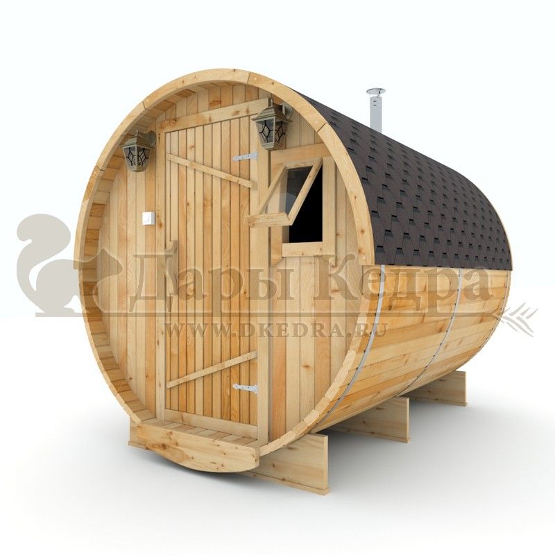 • Баня-бочка буханка из кедра 4 метра Это более просторная модель за счет увеличенной высоты потолков и ровного пола. В такой модели раздевалка совмещена с моечной. Тут установлен душевой поддон, вешалка, полочка и лавочка из кедра. В парильном отделении по обе стороны расположены двухуровневые открытые полки, печь находится между ними у дальней стены. Время растопки такой бани не превышает 30 минут. По вашему желанию баню-бочку можно укомплектовать козырьком, верандой и печью с внешней загрузкой, благодаря которой весь мусор во время топки остается на улице. Баня-бочка буханка не требует полноценный фундамент, поэтому при необходимости ее можно перенести в другое место. Обращаем Ваше внимание, что в стандартную комплектацию бани входят полки открытого типа в парной с обеих сторон. Дополнительно можно заказать полок закрытого типа или лавку! Кедр обладает ароматическими свойствами. Он не деформируется и влагоустойчив, при правильном уходе за деревом на нем не развиваются грибки и плесень.