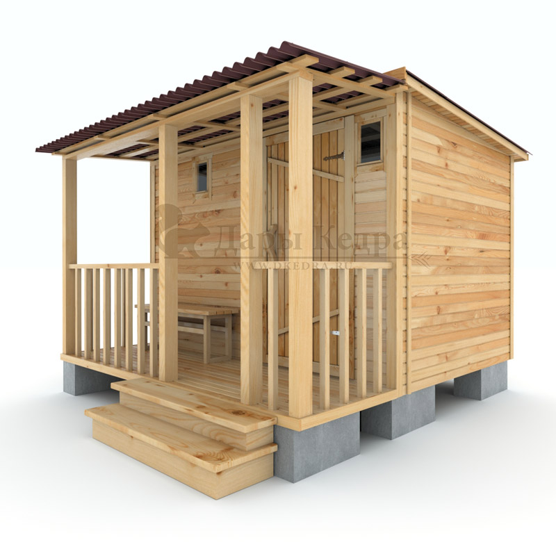• Каркасно-щитовая баня из кедра «Мини» с верандой Это классическая прямоугольная модель бани с двумя отделениями: парилкой и раздевалкой. Для удобства пользования раздевалка оснащена лавочкой и вешалкой. Парилка оборудована двухуровневым открытым полком и печью. За счет небольшой конструкции баня нагревается в течении 30 минут. На просторной веранде можно оставить вещи или отдохнуть после парения. Каркасно-щитовую баню можно заказать как в готовом, так и в разборном варианте. В разборной модели готовые щиты из кедра быстро собираются в полноценное строение, что также позволяет исключить лишний строительный мусор. Такая баня не требует полноценный фундамент, поэтому при необходимости ее можно перенести в другое место. Обращаем Ваше внимание, что в стандартную комплектацию бани входит полок открытого типа в парной. Дополнительно можно заказать полок закрытого типа или лавку! Древесина кедра насыщена эфирными маслами и фитонцидами, которые активируются при воздействии температур. Таким образом, парение в каркаско-щитовых банях из кедра становится еще полезнее.