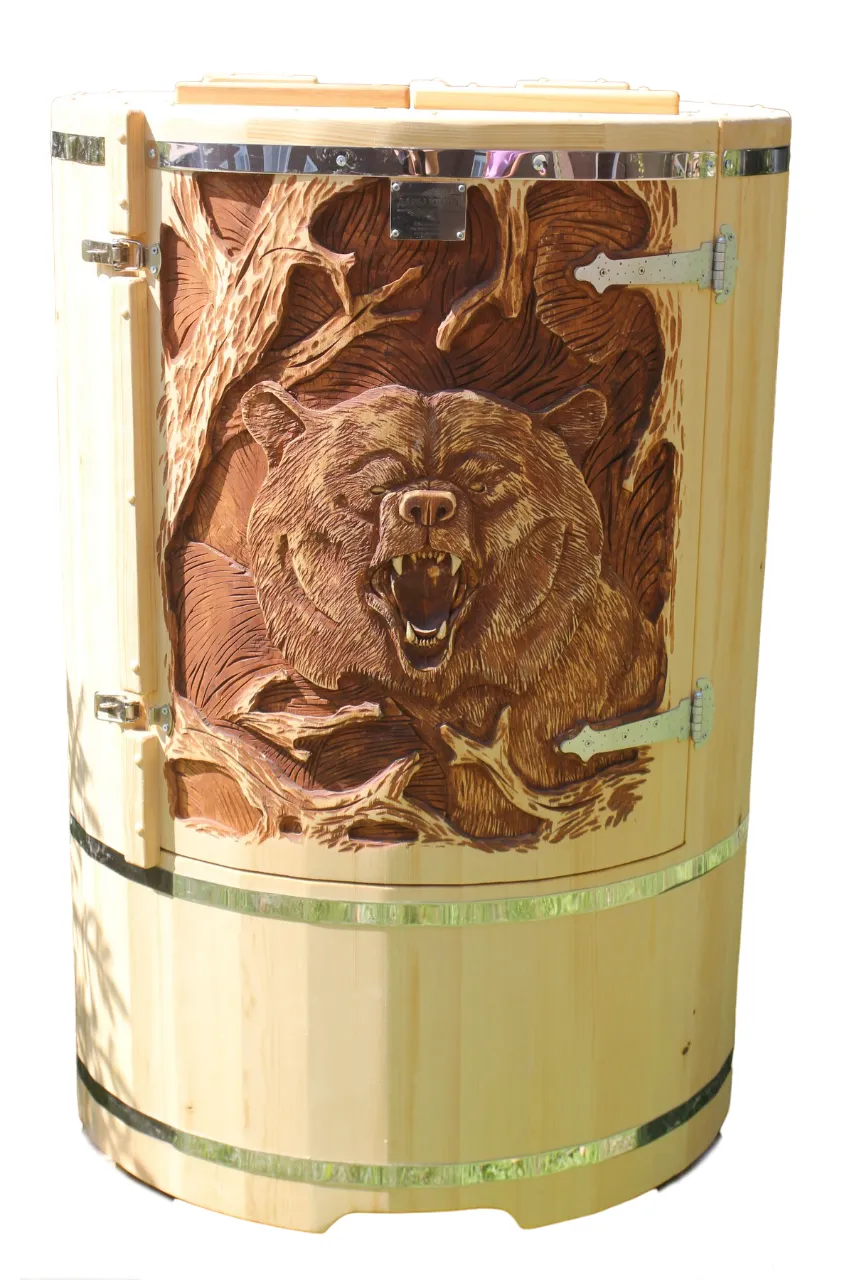 Резьба на дверце кедровой бочки (габаритные фитобочки)