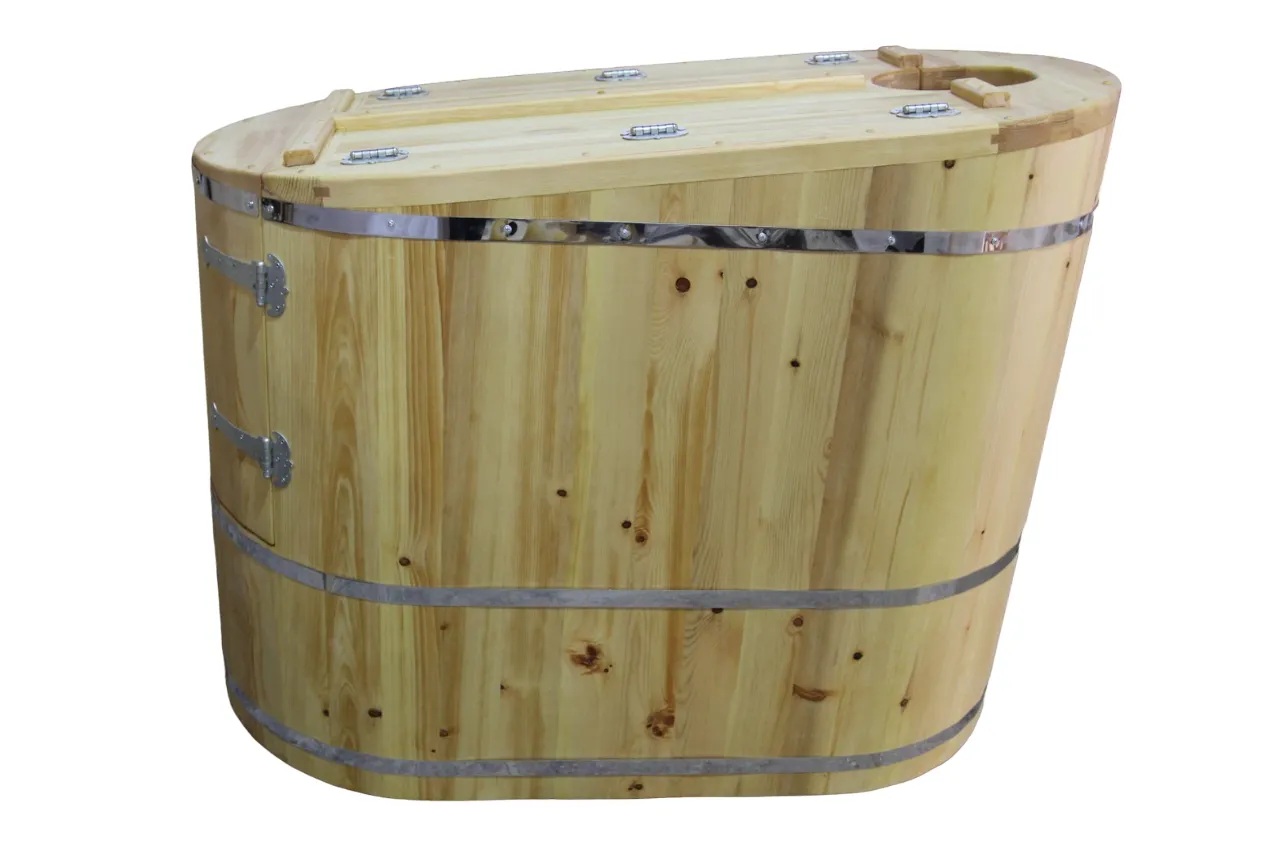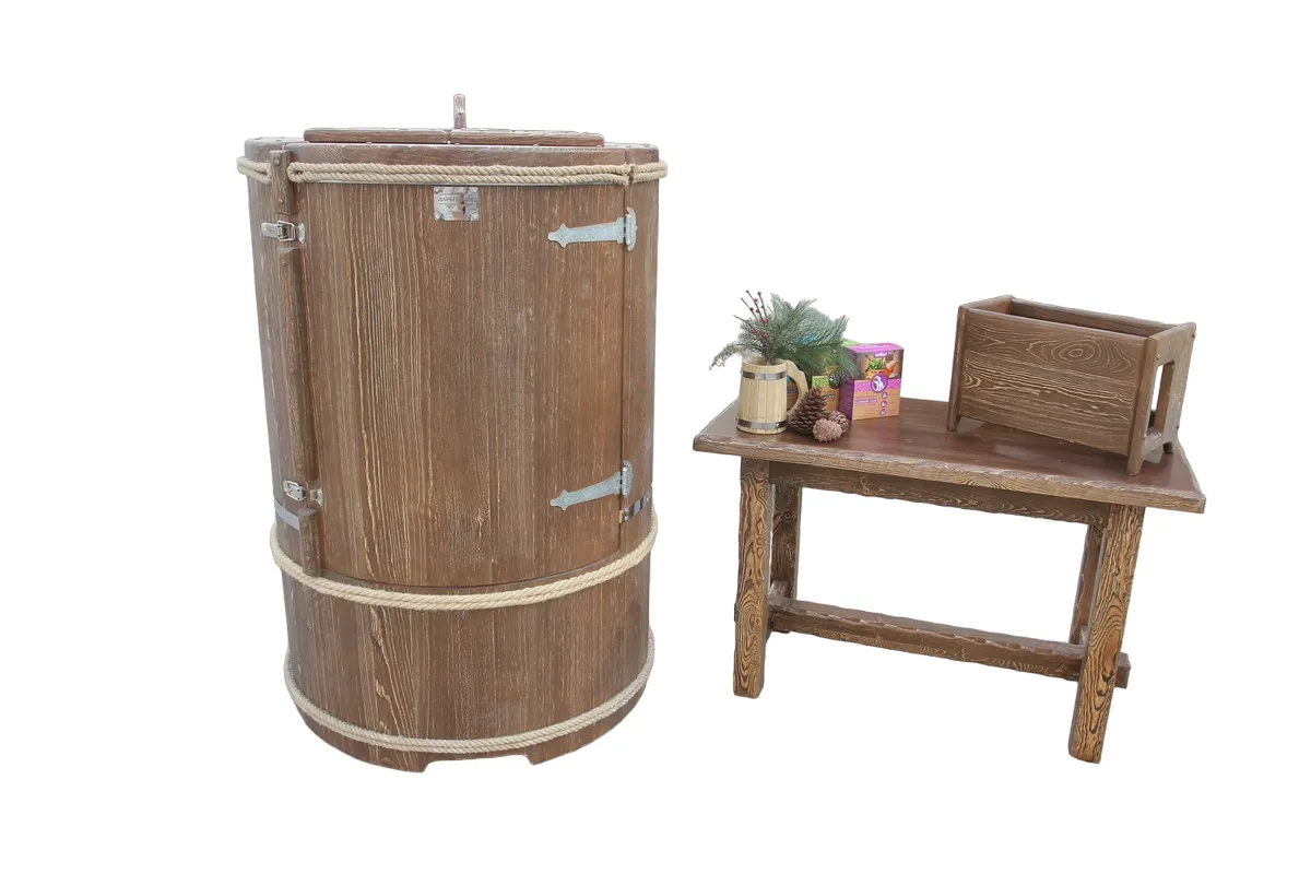 Это круглая фитобочка из кедра увеличенных размеров с толщиной стенок 45 мм. Подходит для людей высокого роста и крупной комплекции. Фитобочка оборудована откидными створками, дверцей и отверстием для головы. Верхний скос изделия делает положение головы более комфортным и улучшает обзор. Во время парения человек сидит внутри кедровой бочки, а голова находится снаружи. Благодаря этому исключается возможность перегрева. Подлокотники из кедра, встроенные ручки на створках и двери делают эксплуатацию более удобной.
