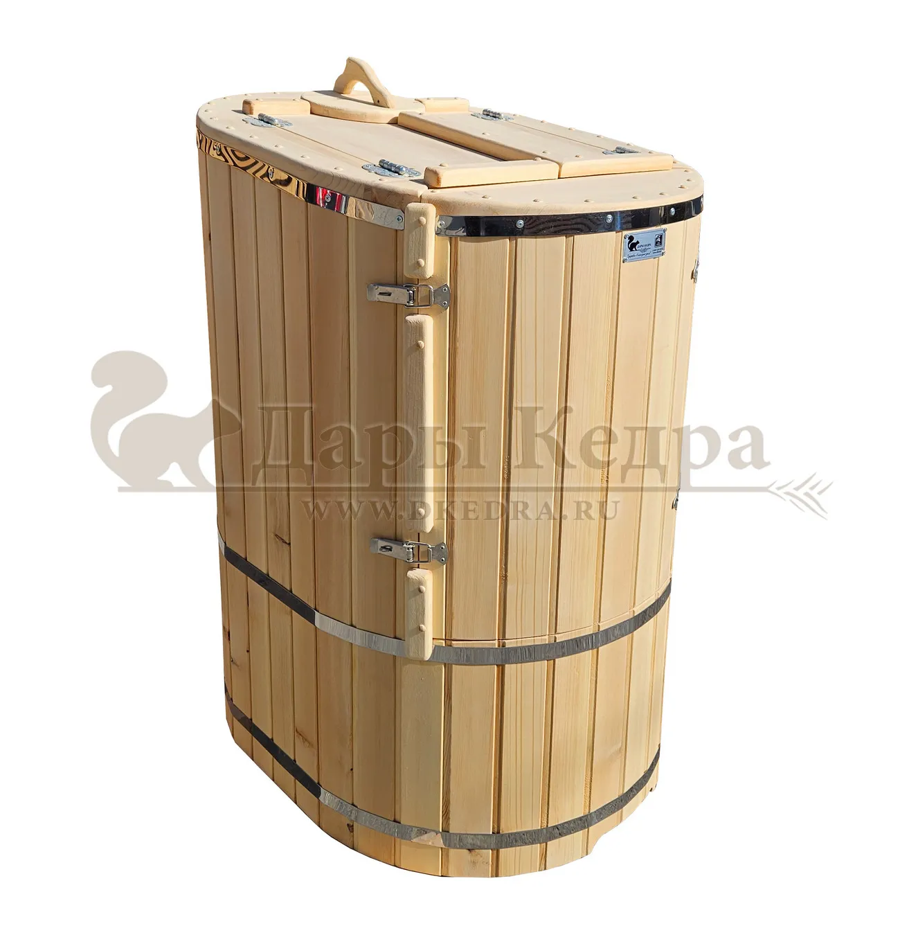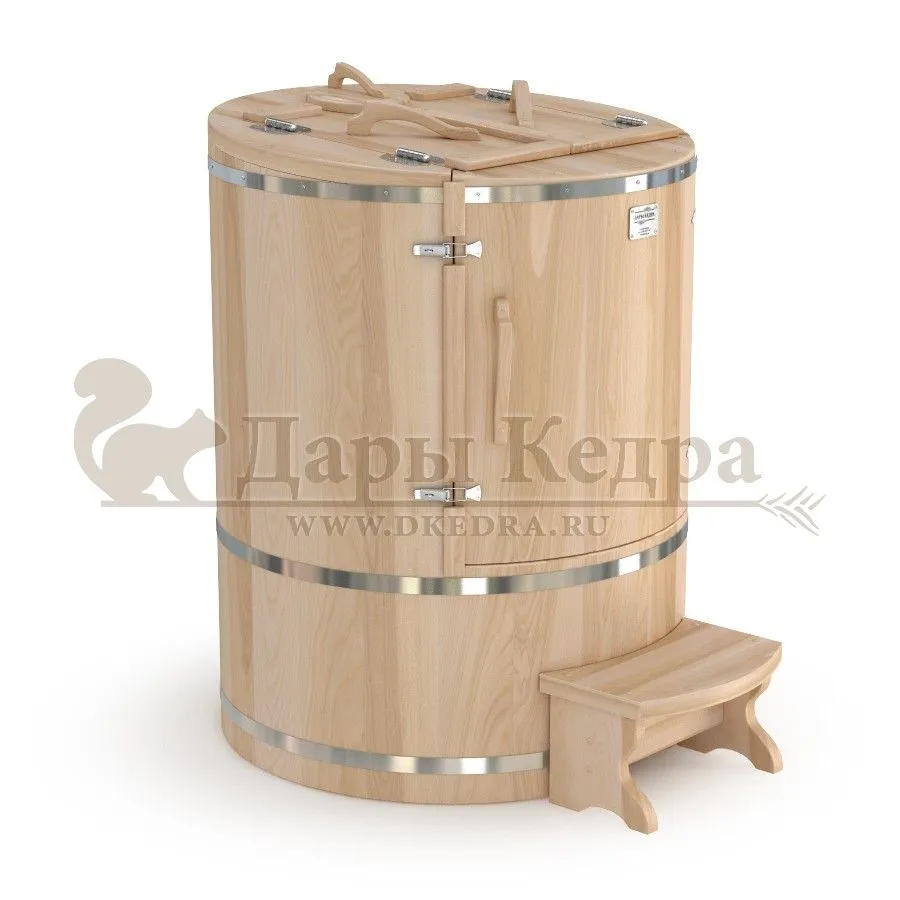 Кедровая бочка (фитобочка) овальная со скосом «Классическая» Овальная фитобочка из кедра - это мини парная, которую можно использовать не только в спа-салонах, но и дома. Овальная модель более просторна и удобна в использовании. Толщина стенок составляет 25 мм. Верхний скос делает положение головы более комфортным и улучшает обзор. Она оборудована откидными створками, дверцей и отверстием для головы. Во время парения человек сидит внутри кедровой бочки, а голова находится снаружи. Благодаря этому исключается возможность перегрева. Подлокотники из кедра, встроенные ручки на створках и двери делают эксплуатацию более удобной. Парение в фитобочке благотворно влияет на организм в целом: повышается иммунитет, выводятся шлаки и токсины, улучшается работа органов тела и состояние кожи.