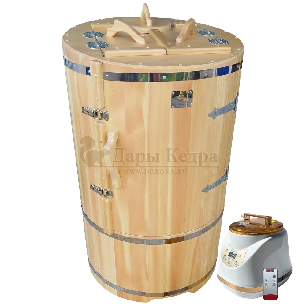 Кедровая бочка (фитобочка) круглая «Двухрежимная Профессиональная» Более продвинутая модель кедровой бочки (фитобочки). Компактное и в тоже время универсальное решение, совмещает в себе фитобочку и инфракрасную сауну. Благодаря толстым стенкам, данная модель отлично подойдет для частого домашнего или коммерческого использования. Пульт управления инфракрасной сауной и парогенератор премиум класса для кедровой бочки (фитобочки) идёт в комплекте, ничего дополнительно приобретать не нужно. Благодаря диаметру 900 мм, в этой бочке будет комфортно даже крупным людям. Купить кедровую бочку (фитобочку) круглой формы двухрежимную профессиональную Вы можете у нас на прямую по цене производителя.