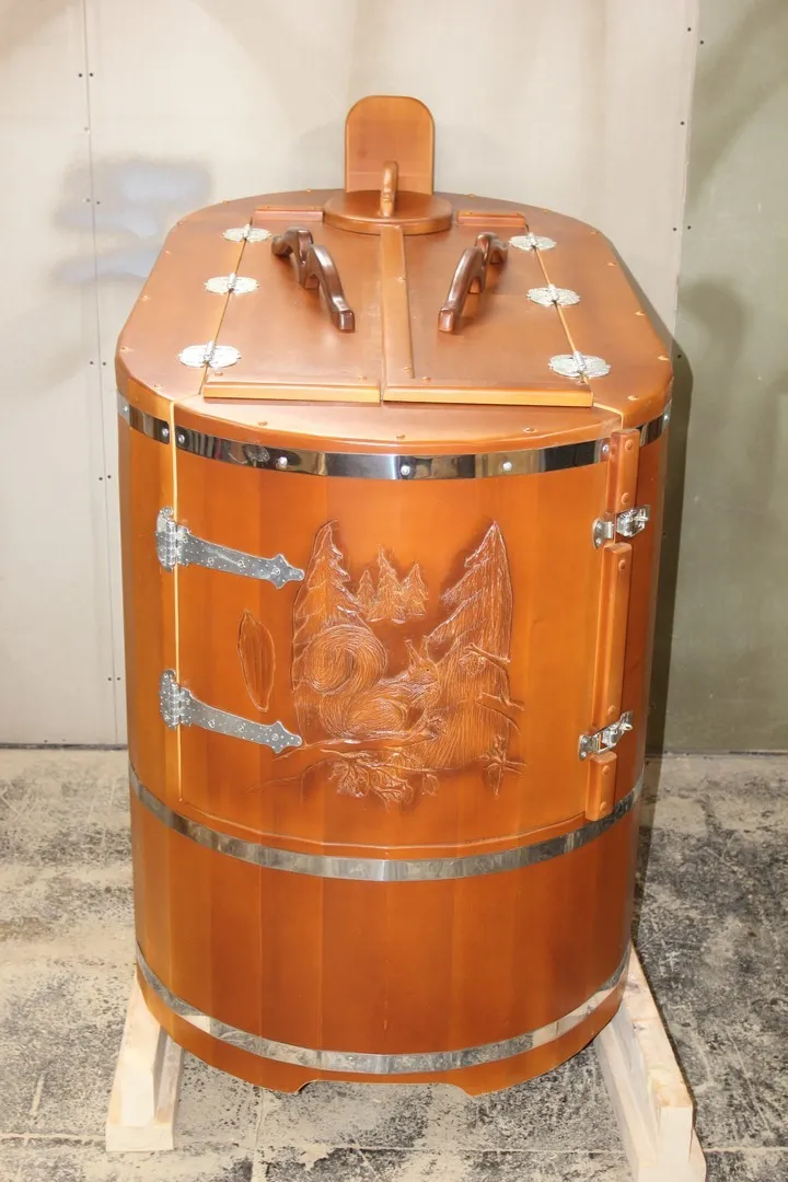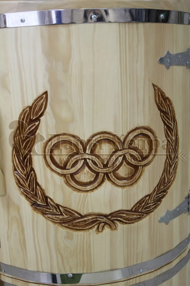 Кедровая бочка (фитобочка) «Олимпийский чемпион» Это эксклюзивная фитобочка любой модели и комплектации с резьбой вашего логотипа или фирменного знака. Просто приготовьте эскиз рисунка, и наши мастера перенесут его на изделие. Авторский рисунок на фитобочек придаст оригинальность вашему дому или салону красоты, подчеркнёт вашу индивидуальность и непревзойденный вкус. Художественная резьба это ручная работа, выполняется разными мастерами и каждый рисунок неповторим. Вы можете выбрать предложенные варианты резьбы или подобрать изображение и мы предложим вам подходящий эскиз. На сайте представлены наши работы в качестве примера. Каждая резьба рассчитывается индивидуально и может быть нанесена на любую модель фитобочки. Парение в фитобочке благотворно влияет на организм в целом: повышается иммунитет, выводятся шлаки и токсины, улучшается работа органов тела и состояние кожи. Обязательно обращайте внимание на размер дверных проемов вашего помещения. Если они меньше 78 см, то закажите разборную модель!