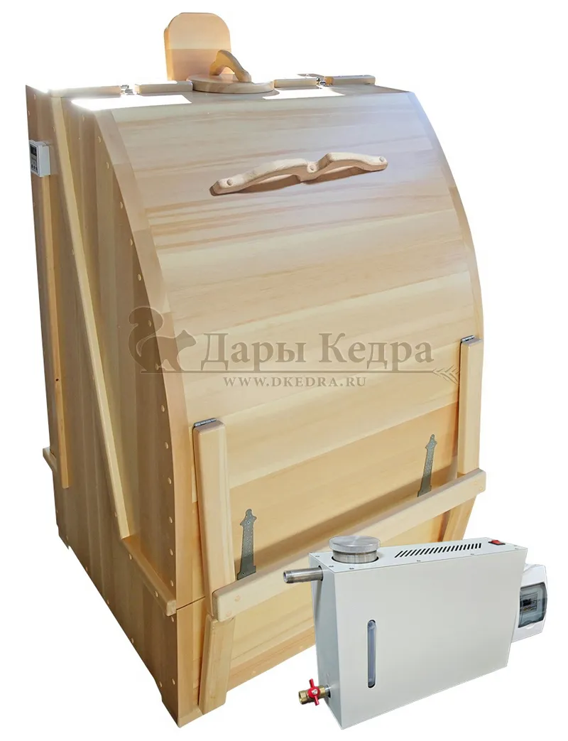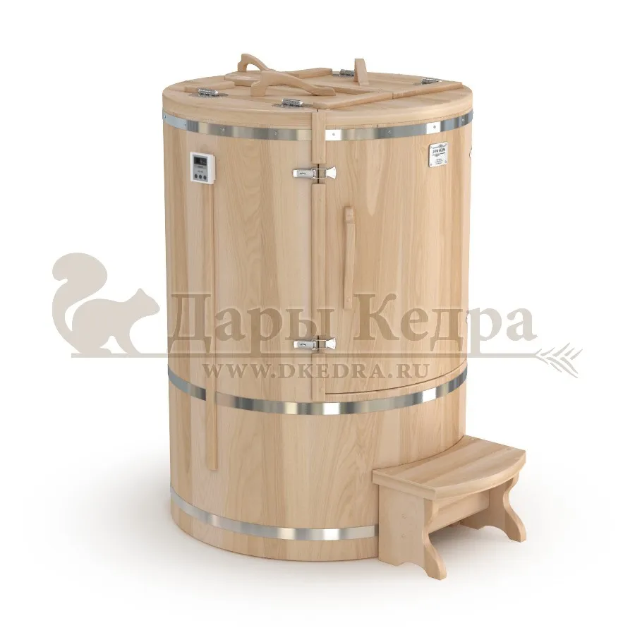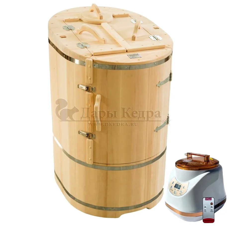 Готовый комплект «Удобный+»: кедровая бочка с парогенератором + био-защита изнутри и снаружи Готовый комплект - это полностью укомплектованный набор с фитобочкой для процедур парения. Овальная модель более просторна и удобна в использовании. Толщина стенок составляет 25 мм. Бочка оборудована откидными створками, дверцей и отверстием для головы. Верхний скос изделия делает положение головы более комфортным и улучшает обзор. Во время парения человек сидит внутри кедровой бочки, а голова находится снаружи. Благодаря этому исключается возможность перегрева. Подлокотники из кедра, встроенные ручки на створках и двери делают эксплуатацию более удобной. Парение в фитобочке благотворно влияет на организм в целом: повышается иммунитет, выводятся шлаки и токсины, улучшается работа органов тела и состояние кожи.