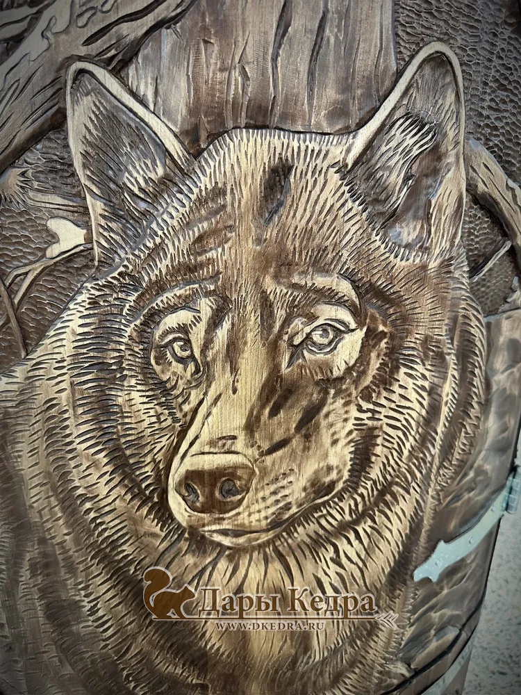 Кедровая бочка (фитобочка) «Сибирский волк» Модель «Сибирский волк» — это сочетание художественного мастерства и оздоровительных технологий. Уникальная резьба на фасаде превращает обычную фитобочку в предмет роскоши, который станет украшением вашего интерьера. Особенности модели: Материал высшего качества: Изготовлена из отборного алтайского кедра, богатого фитонцидами для максимального оздоровительного эффекта. Эргономика: Регулируемое по высоте сиденье позволяет с комфортом принимать процедуры людям любого роста. Премиальная отделка: Наружное покрытие лаком защищает дерево, а внутреннее покрытие маслом сохраняет его дышащие свойства. Дополнительные опции для вашего комфорта и стиля: Разборный вид: Удобство транспортировки и установки даже в помещениях с узкими проемами. Декорирование канатной веревкой: Эстетичное дополнение, не влияющее на функциональность. Искусственное старение (браширование): Придаст изделию особый шарм и выразительность. Экстра сорт кедра: Для ценителей идеально чистой древесины без сучков. Эргономика: Подголовник, подспинник, подставка для прогрева ног, приступки (одно- или двухступенчатые), дополнительный уровень сидений для детей. Защитные покрытия: Покрытие дна жидкой резиной снаружи, покрытие воском для защиты и подчеркивания текстуры дерева. Регулярные сеансы в бочке «Сибирский волк» помогут снять стресс, очистить организм от токсинов и укрепить сердечно-сосудистую систему. Почувствуйте силу дикой природы у себя дома!