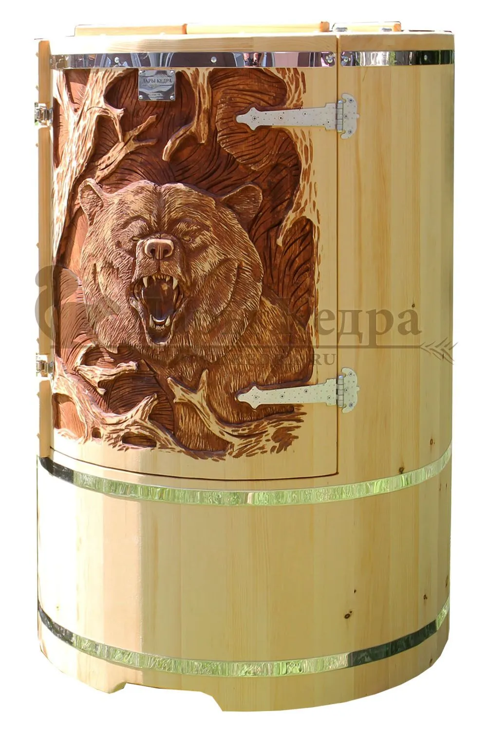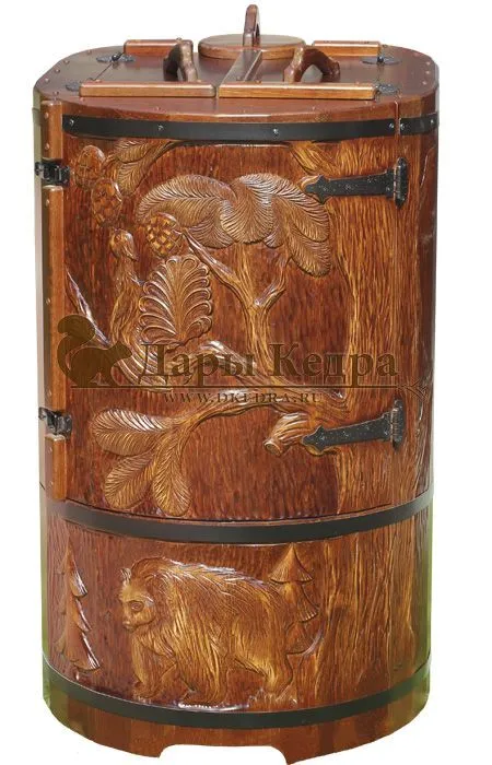 Кедровая бочка (фитобочка) «Бурый медведь» Любая модель эксклюзивной фитобочки - это выбор не только дизайнеров и ценителей красоты, но и тех, кто любит нестандартный подход в любых деталях. С оригинальной авторской фитобочкой Дары Кедра ваша квартира, дом или салон красоты станут объектом всеобщего внимания, ведь такая фитобочка - это не просто смело, красиво и достойно, это еще и очень полезно для Вашего здоровья! Художественная резьба это ручная работа, выполняется разными мастерами и каждый рисунок неповторим. Вы можете выбрать предложенные варианты резьбы или подобрать изображение и мы предложим вам подходящий эскиз. На сайте представлены наши работы в качестве примера. Каждая резьба рассчитывается индивидуально и может быть нанесена на любую модель фитобочки. Эксклюзивная фитобочка может быть представлена в разной цветовой гамме: После того, как цвет фитобочки выбран, необходимо определиться с вариантом резьбы (или предложить свой): Фитобочку можно также декорировать канатной веревкой в места обручей из нержавеющей стали (оплачивается дополнительно).
